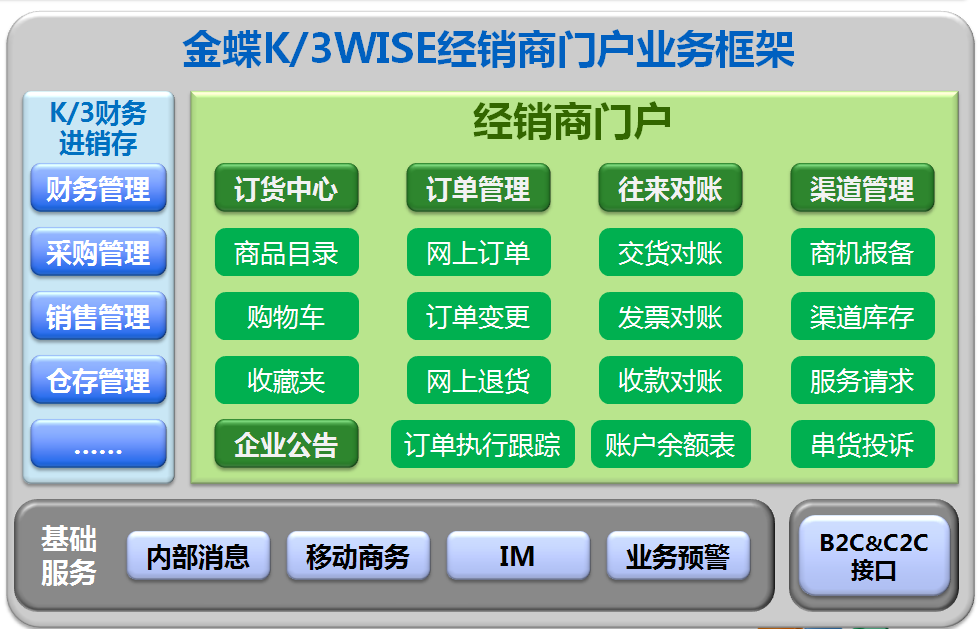 金蝶經(jīng)銷商管理解決方案 經(jīng)銷商管理系統(tǒng)主要以K/3WISE經(jīng)銷商門戶模塊為主,介紹經(jīng)銷商如何通過經(jīng)銷商門戶進(jìn)行溝通、訂貨、退貨、對賬等,形成金蝶K/3WISE經(jīng)銷商門戶解決方案。 適用企業(yè) 具有完整的經(jīng)銷商網(wǎng)絡(luò),希望提高經(jīng)銷商綜合管理水平,完善經(jīng)銷商業(yè)務(wù)的企業(yè) 企業(yè)特征 經(jīng)銷商訂貨量大,希望通過更快捷的方式下訂單 經(jīng)銷商希望能實(shí)時(shí)了解訂單狀態(tài) 經(jīng)銷商希望了解企業(yè)庫存,以免出現(xiàn)下單無貨的情況 供求雙方對賬業(yè)務(wù)繁雜,希望能方便快捷的處理對賬 企業(yè)希望能有效分析管理經(jīng)銷商庫存 適用行業(yè) 電子、機(jī)械、家電、五金等制造行業(yè)均可